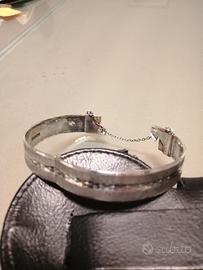 Motivo decorativo centrale a diamante, chiusura a scatto con catenella di sicurezza, altezza della fascia cm. 1,2 diametro cm. 6 circonferenza int . cm. 18,peso g. 40.Unico segno di usura l'annerimento dell'argento che ho in parte rimosso con un prodotto adeguato.