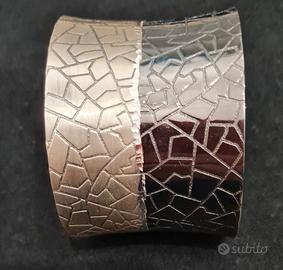 Vendo bracciale in argento 925, modello schiava. La finitura è effetto craquele' in 2 colori, argento satinato opaco e l'altra metà argento placcato in rutenio, colore nero lucido. Il bracciale è molto bello, di sicuro effetto , seppure molto leggero e adattabile sul polso. Pesa circa 30 grammi .