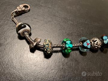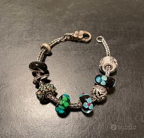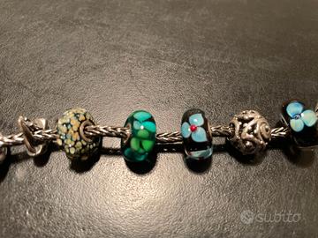 Bracciale Trollbeads. Il bracciale è componibile a piacere, realizzato artigianalmente con materiali di altissima qualità. Il bracciale è in argento con chiusura con fiore. E' composto da 6 beads in vetro e 2 in argento. Completo di 2 Stop Argento utili per bloccare lo scorrimento dei beads sul bracciale. In ottimo stato. Originale.