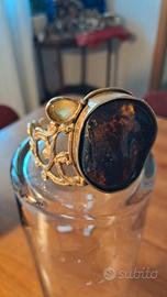 Bracciale in bronzo dorato, con ambra dominicana e quarzo citrino lattescente realizzato a mano con tecnica a cera persa e ispirato a modello di elsa di spada celtica.