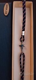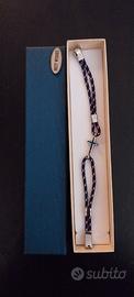 Vendesi bracciale da uomo in cordino intrecciato blu, con dettagli decorativi in rosso e bianco e impreziosito da una croce in metallo lucido al centro. È dotato di chiusura in metallo resistente. Viene fornito in una scatola regalo con la scritta “Best Wishes”.