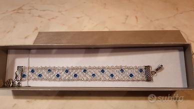 Bellissimo bracciale fatto a mano in pizzo a tombolo, con pietre blu, brand Il merletto di Offida. Ottima idea regalo.