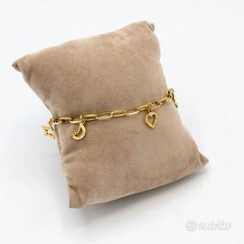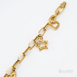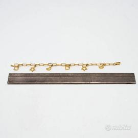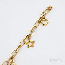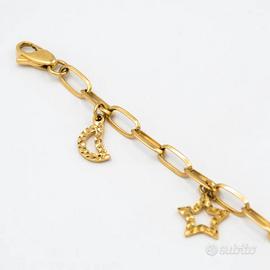 Bracciale in oro giallo 18 kt grammi 9 pieno a catena con ciondoli raffiguranti la luna , la stella e il cuore. I ciondoli hanno una lavorazione molto brillante. Il bracciale è lungo cm. 18,8. Prodotto made in Italy munito di marchio di fabbrica come da legge e completo di confezione e certificato di qualità rilasciato dalla Gioielleria.