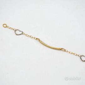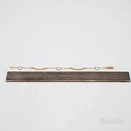 Bracciale in oro giallo e bianco 18 kt grammi 2,1 con sbarrette tubolari e 3 cuori in oro bianco 18 kt lungo cm. 18,3. Prodotto made in Italy munito di marchio di fabbrica come da legge e completo di confezione e certificato di qualità rilasciato dalla Gioielleria.