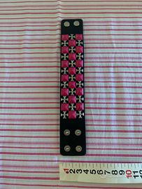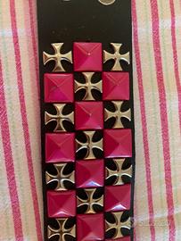 Vendesi bracciale largo in pelle nera, con borchie metalliche a croce e quadrate dipinte color fucsia alternate.