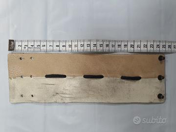 bracciale in pelle, parte bianca verniciata. chiusura con asola e perni in metallo.