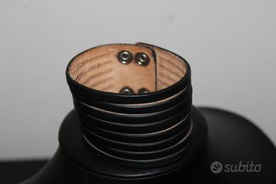 Design moderno e anima artigianale si incontrano in questo bracciale in vera pelle nera inciso a linee orizzontali. Ogni taglio è realizzato a mano, creando un effetto a coste che dona un’estetica molto attuale, decisa e originale. Un accessorio che parla di forza, equilibrio e attenzione al dettaglio.