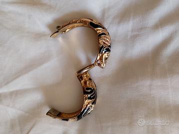 Vendo particolare leone decorativo in metallo dorato, firmato Bijoux Cascio, un pezzo dal design distintivo e vintage. I suoi occhi erano originariamente due pietre verdi, ma una è mancante, dettaglio che ne esalta il fascino vissuto e l’unicità.
