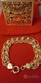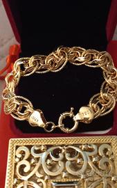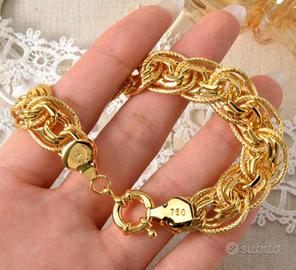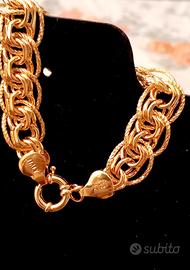 Splendido bracciale dal design importante e voluminoso,caratterizzato da una raffinata maglia intrecciata (stile bizantino/cordonetto) che alterna maglie lucide a maglie lavorate.Un pezzo di alta bigiotteria artigianale che unisce l'eleganza classica del "Made in Italy" a una presenza scenica incredibile.Il bracciale ha una consistenza reale e solida, con un peso di 30 grammi, che conferisce una sensazione di pregio una volta indossato.Materiale: Base metallica di alta qualità in rame con spessa placcatura in Oro 18kt (750).Lunghezza: 20 cm.Peso: 30,0 g (come da foto su bilancia di precisione).Invio in scatola in velluto rosso.
