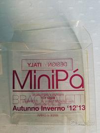 Bracciale marca "MINIPA' by Le Pandorine" in gomma di color blu con ciondolo a forma di borsa (sempre di gomma) senza chiusura. Diametro 6 cm. Indossato pochissime volte. Con scatola trasparente originale.