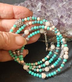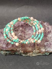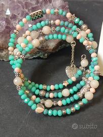 bracciale a spirale con agata bianca, vetro turchese,rosa, distanziatori acciaio stile etnico pezzo unico fatto a mano da me