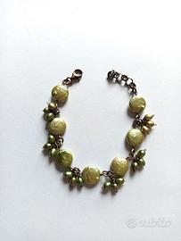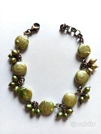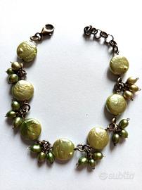 bracciale in metallo argentato, perle di fiume verde chiaro e verde scuro, fatto a mano.