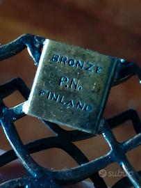 Bracciale modernista finlandese in bronzo degli anni '70 di Turun Hopea progettato da Pipa Niinimäki. Marcato BRONZO PN. FINLANDIA Chiusura a scatto e catenella di sicurezza. Adorna il tuo polso con uno squisito gioiello dal design modernista. Questo bracciale in bronzo degli anni '70, disegnato da Pipa Niinimäki per Turun Hopea, è un sofisticato esempio dell'artigianato orafo finlandese. Le linee eleganti e la tonalità metallica creano un'estetica senza tempo, perfetta per qualsiasi guardaroba alla moda. È stato pulito e lucidato, pronto per essere indossato. Misure di riferimento in foto. Le foto descrivono esattamente il bracciale e sono parte integrante della descrizione. Visita il mio profilo per altri anelli e gioielli etnici e non solo.