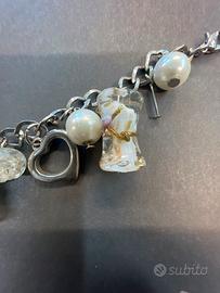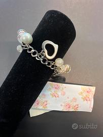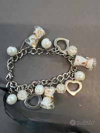 Braccialetto a catena con pendagli Monnalisa. Accessori caramelle, perle e cuoricini, tutto in materiali anallergici. Chiusura a moschettone. Circonferenza diametro 19 centimetri.