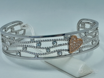 Bracciale rigido a schiava, facile da allargare e strigere in quanto è aperto sul retro. Impreziosito dai cristalli bianchi incastonati sia sul cuore in acciaio PVD placcato oro rosa sia sul resto del bracciale.
