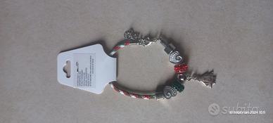 Vendesi bracciale in cordino intrecciato rosso, verde e bianco, con pendenti a tema natalizio (alberello, cuoricini e perline). Chiusura regolabile, leggero e comodo da indossare.