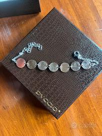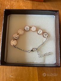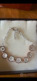Bracciale personalizzato con nome Alessia composto da elementi circolari con lettere centrali e contorno di strass decorativi. realizzato in lega metallica. con finitura lucida tipica della bigiotteria fashion. chiusura con moschettone e catenina regolabile per ogni misura di polso. completo di scatola e busta originale, Duccio