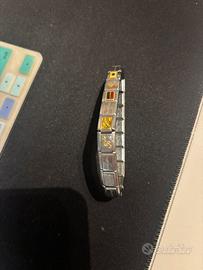 Vendo bracciale Nomination con inserti vari in oro : croce celtica, chiave di violino, vespa. Bandiera italiana e due bandiere nautiche.
