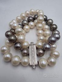 Meraviglioso bracciale perle con la chiusura in oro bianco 18 carati con 14 diamanti naturali di taglio brillante e ben 3 file di perle, 2 bianche e una di perle grigie degradé con diametro da 11 millimetri a 18,5.