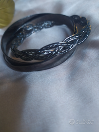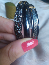 Vendo insieme a tre bracciali di bigiotteria incrociati colore argento e bracciale rigido verde scuro.