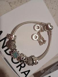 Bracciale Pandora misura 18 cm con 4 charme (cuore alato, serpente, zampina, quadrifoglio doppio colorato) 2 chiusure blocca charme con brillantini E 1 catenella cuori per sicurezza chiusura.