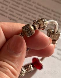 Bracciale Pandora componibile con chiusura, fermi e 9 charms diversi. Come nuovo, usato 3/4 volte, nessun difetto.