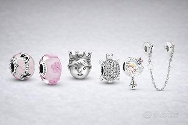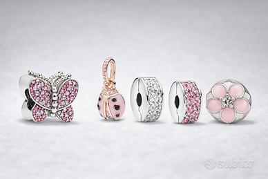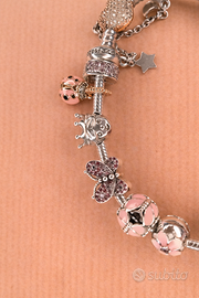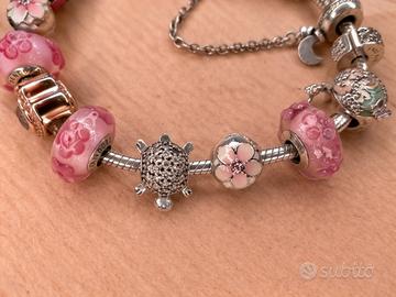 Bellissimo bracciale modello Pandora Moments in argento 925 con maglia snake e chiusura a cuore pavé, completo di 15 elementi coordinati nelle tonalità rosa, argento e dettagli luminosi. Il bracciale si presenta già armonico e pronto da indossare, con una composizione elegante e ben bilanciata che unisce elementi decorativi floreali, soggetti simbolici e inserti in vetro tipo Murano. Caratteristiche Argento 925 Maglia snake flessibile Chiusura a cuore con dettagli luminosi Presenza di clip e catena di sicurezza Inserti in vetro decorato e finiture rosate Ottime condizioni, ben conservato. Completo di scatola. Le ultime foto mostrano il dettaglio dei charm montati. Composizione (15 elementi totali) Bracciale con chiusura a cuore Clip decorative (argento e tonalità rosa) Catena di sicurezza Charm con soggetti: farfalle, fiori, coccinella, cuore, tartaruga Elementi in vetro decorato stile Murano Charm con finitura rosata e dettagli luminosi
