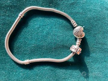 Bracciale originale Pandora con un ciondolo (anellino con strass rosa) e chiusura a cuore, in argento. Ottime condizioni. Fornisco senza scatola