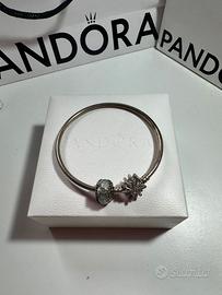 Bracciale originale Pandora rigido in argento con chiusura fiocco di neve pavé, con un charm, misura 19