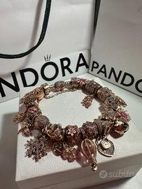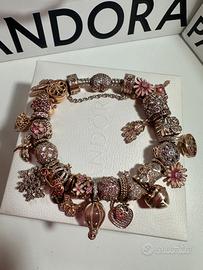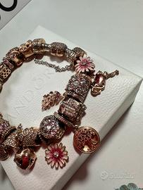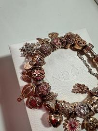 Bracciale originale Pandora, moments con chiusura cuore pavé in oro rosa completo di 23 charm e catena di sicurezza, misura 19