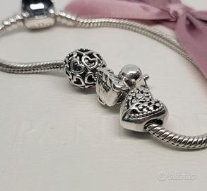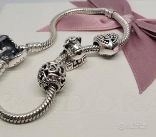 Bracciale Pandora Originale Chiusura Cuore con tre Ciondoli Inclusi, Openwork di Cuori, Unicorno e Albero della Vita Usato, in buone condizioni, lunghezza totale cm 19,5 (comprensivo di chiusura) Tutto Originale Pandora