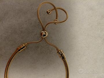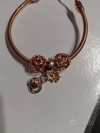 Bracciale Pandora Moments con finitura in oro rosa 14 carati, completo di vari charm. Il bracciale ha una chiusura regolabile a sfera, che permette di adattarne la misura e maglia snake. Completo di n. 3 charmes di cui due aperti e uno a pendentea tema "buona fortuna".