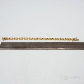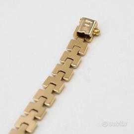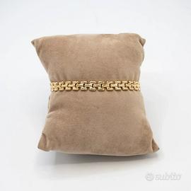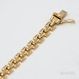 Bracciale donna in oro giallo 18 kt grammi 12,7 lungo cm 18. La maglia è la panter, la lavorazione è scatola, lucida e molto pesante. La chiusura è a scomparsa più una laterale di sicurezza. Prodotto made in Italy munito di marchio di fabbrica come da legge e completo di confezione e certificato di qualità rilasciato dalla Gioielleria.