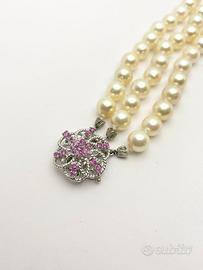 Bracciale con tre fili di perle coltivate e con chiusura in oro bianco 18 KT ( 750‰ ) di grammi 42.28 impreziosito da rubini naturali forma tonda e taglio sfaccettato, epoca 1950.