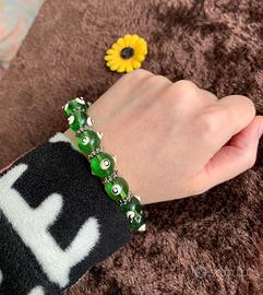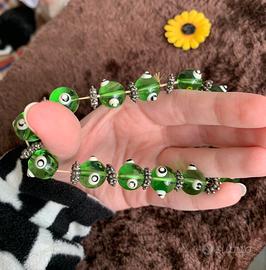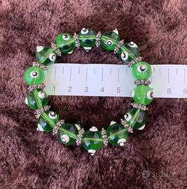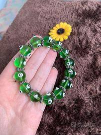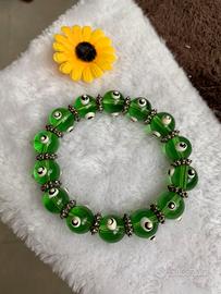 Vendo bracciale elastico portafortuna con perle di color verde effetto vetro e simbolo di "evil eye", detto anche nazar.