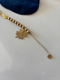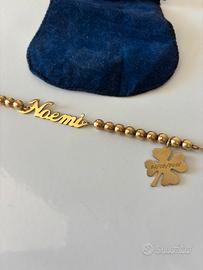 Braccialetto personalizzato con nome Noemi e quadrifoglio portafortuna con incisa una data (si può anche togliere), marca MD (MagneticDays) Jewelry, in argento 925 placcato oro, lunghezza 22 cm, peso 10g circa, la punzonatura è riportata sulla chiusura. In ottime condizioni come nuovo. Prezzo 30€.