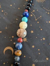 Bellissimo braccialetto Pianeti realizzato con pietre naturali e dettagli in argento 925. - Rappresentazione dei pianeti del sistema solare. - Pietre selezionate per colore e texture. - Mercurio : labradorite 6 mm - Venere : occhio di tigre 8 mm - Terra : sodalite 8 mm - Marte : diaspro rosso 6 mm - Giove : pietra paesina 12 mm - Saturno : giada gialla 10 mm - Urano : Amazzonite (Russia) 8 mm - Nettuno : lapislazzuli 8 mm - Plutone : diaspro brecciato 4 mm - spazio : onice nero - Chiusura moschettone a pera in argento 925. - cavo d'acciaio Misura regolabile grazie alla catena di estensione in argento 925 fino a 22 cm
