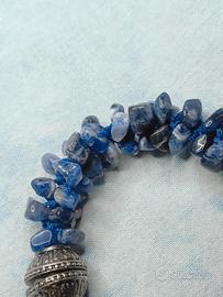 Bracciale donna con perle in quarzo blu (sodalite) a schegge di pietre naturali. Presenta ciondolo centrale grande e due sfere decorative in metallo tono argento antico. Chiusura magnetica pratica e sicura. Gioiello estivo stile boho etnico. Colore blu intenso.
