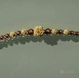 Vendo bracciale Prada dorato con cristalli color ambra con rosa centrale.Mai utilizzato e’ in perfette condizioni. Senza scatola originale.Misura cm 20 con chiusura a clip firmata Prada .