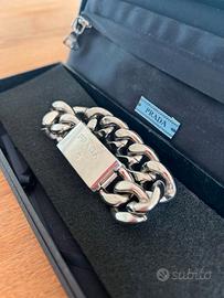 Vendo bracciale originale Prada, di colore argento/cromato, lungo circa 20 cm e largo 2 cm.