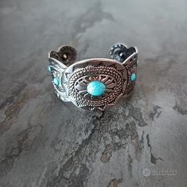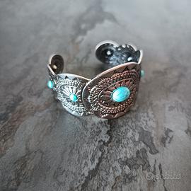 Elegante bracciale rigido a fascia in stile argento tibetano lavorato. Dettagli: Decorato con pietre color turchese e intarsi etnici. Vestibilità: Apertura a molla, si adatta a ogni polso. Nuovo, mai usato. Perfetto come idea regalo o per completare un outfit estivo.