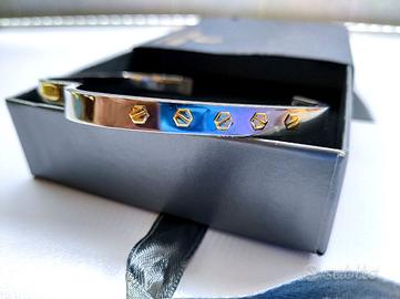 Bracciale rigido "Kimera" da donna in acciaio con elementi in oro (il logo e gli esagoni). Chiusura a incastro. Misure "interne" 55x46. Ancora nella scatola originale. Ideale come regalo per compleanno o festa della mamma.
