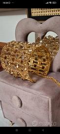 Bracciale rigido a fascia larga color oro Max Mara vintage modello cuff a grata traforata impreziosita da cristalli o strass luccicanti. In metallo color oro con catenella e gancetto per adattarsi al polso. Decorato con cristalli e strass incastonati che creano un effetto luminoso e brillante. Lunghezza 7 cm Circonferenza 19 cm. Senza logo perché vintage degli anni 80