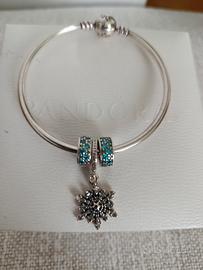 BRACCIALE RIGIDO PANDORA ARGENTO STERLING 925 CON CHARM FIOCCO DI NEVE E 2 CLIP FERMA CHARMS DECORATE CON PAVÉ AZZURRO. PERFETTE CONDIZIONI. NELLA SUA SCATOLA ORIGINALE. CHIUSURA A SFERA CON LOGO PANDORA
