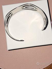 Bracciale rigido aperto, acciaio. Dettagli dorati, presente anche un timbro, ma non ricordo la marca. Indossato pochissime volte. Disponibili a spedizione oppure a consegna a mano in zona Roma Tiburtina, vicino stazione.