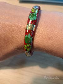 Bracciale rigido, genuinamente vintage, smaltato. Misura internamente circa 6,5 centimetri, spessore poco meno di un centimetro. Riporta, sia internamente, sia esternamente, delicate decorazioni floreali rosa e verdi bordate d'oro su sfondo rosso. Chiusura solida, in perfette condizioni: veramente originale e d'impatto.