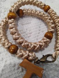 Rosario con tau in legno tessuto a mano. Filo in raso. Perline in legno. Da mettere come bracciale.