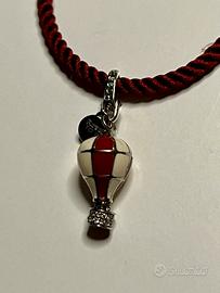 Bracciale originale Rosato, collezione “Travel”, realizzato con cordoncino intrecciato rosso bordeaux e charm a forma di mongolfiera in argento 925 smaltato bianco e rosso, con piccoli punti luce sulla base.
