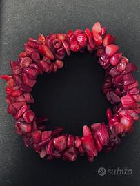 Splendido bracciale realizzato con frammenti irregolari (chips) di pasta di corallo rosso intenso. Un accessorio versatile, perfetto per dare un tocco di colore ed eleganza sia a look estivi che invernali.