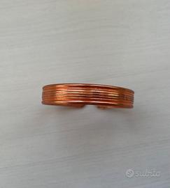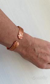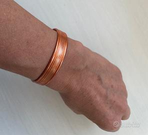 bracciale in rame semirigido con applicati ai bordi due quadrifogli, lavorazione a righe stondate leggermente in rilievo, circonferenza bracciale cm. 18, altezza cm. 1,1, nuovo mai indossato con sacchetto e istruzioni vendesi euro 7